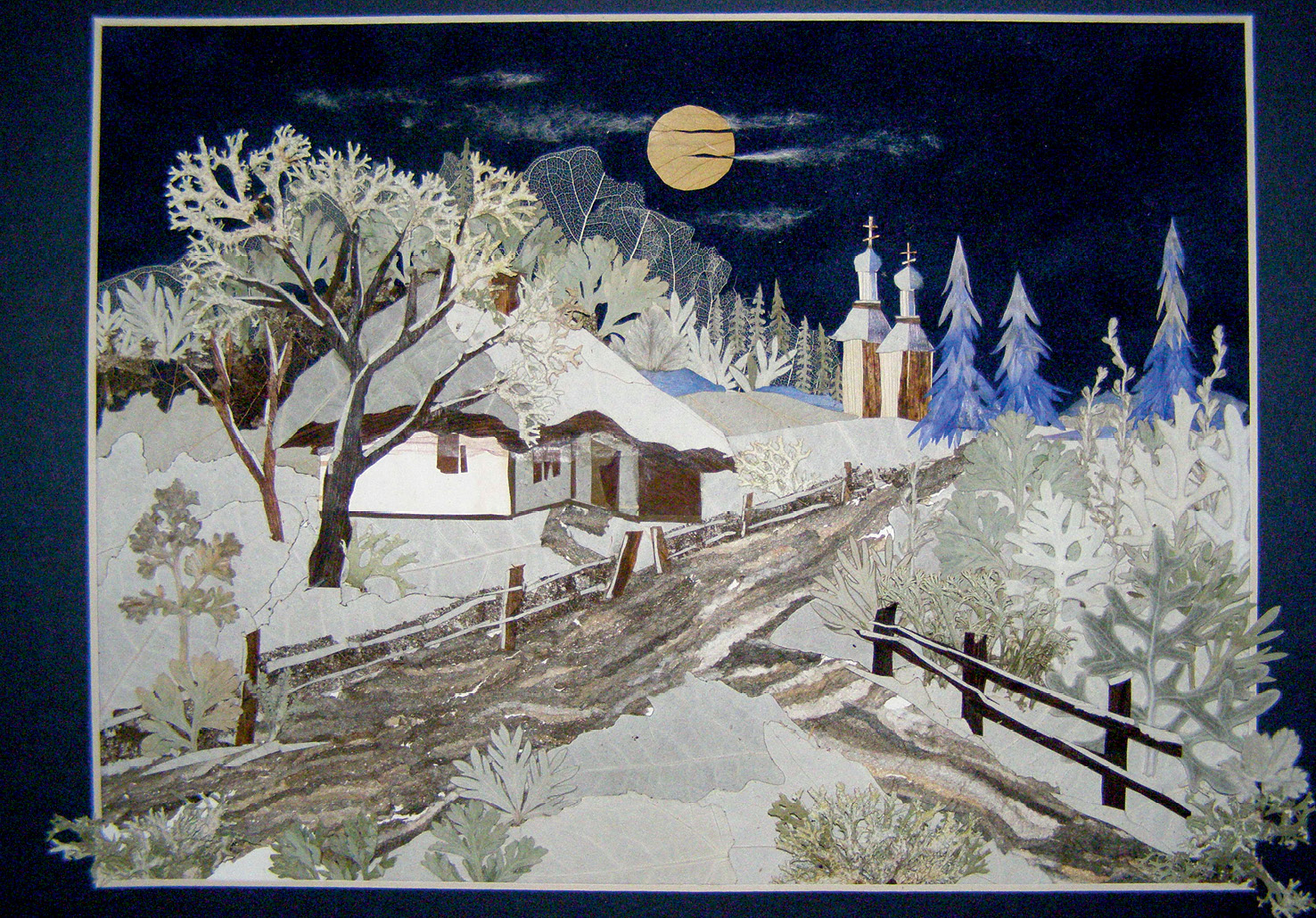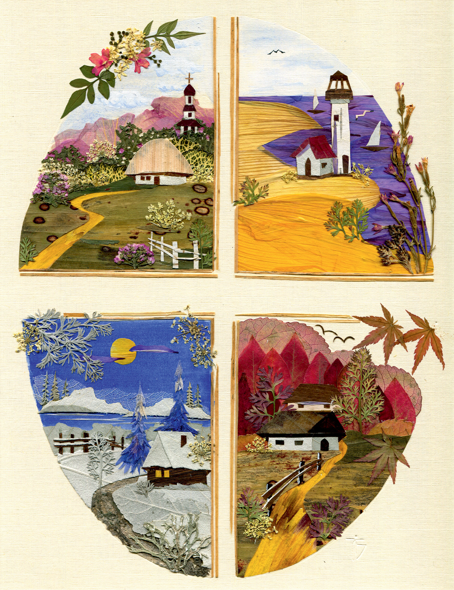 Ось тут я і побачив її нині знаменитих квіткових панночок – під парасольками, в ажурних капелюшках та барвистих сукнях, птахів на даху, українські засніжені й уквітчані хати, ставки й сільські вулиці, розлогі дуби над ярами, осінні небокраї й різдвяні мотиви, виконані в незвичній, «рослинній» техніці, лише з дарів природи: квітів, трав, листочків дерев, тоненьких травинок. Абсолютно без пензля та фарб!